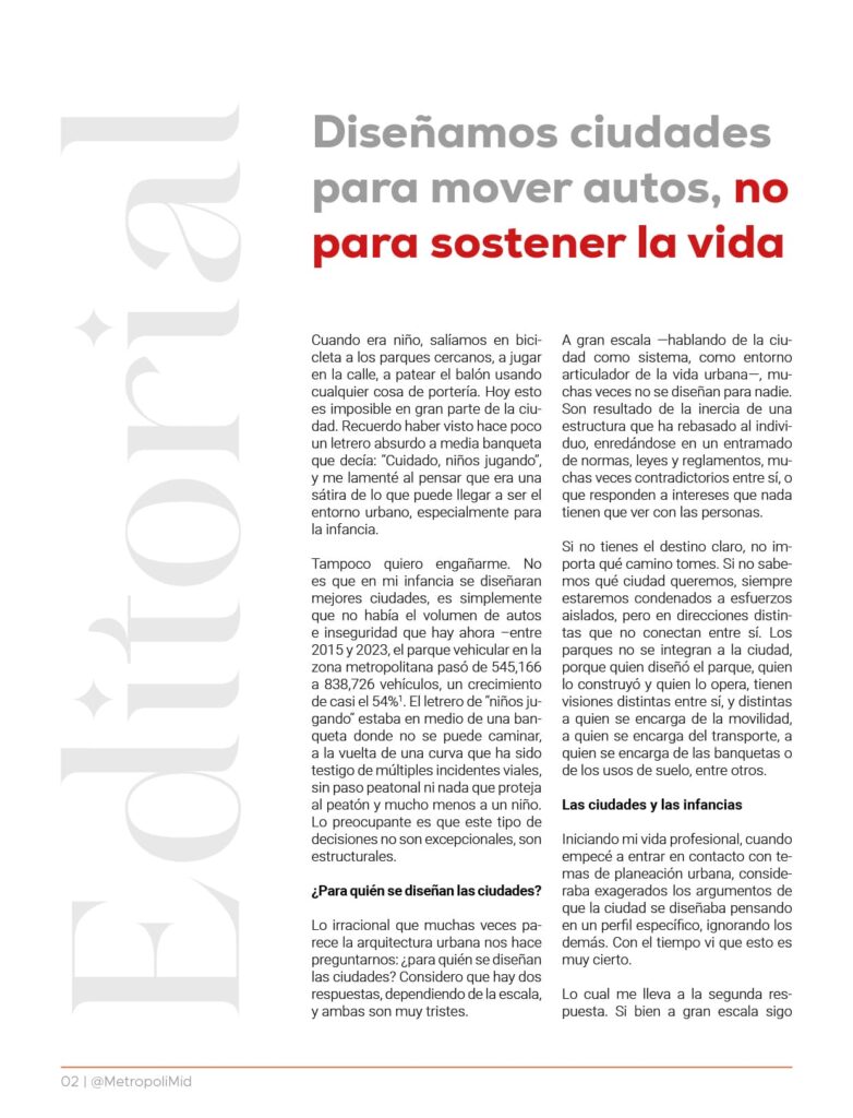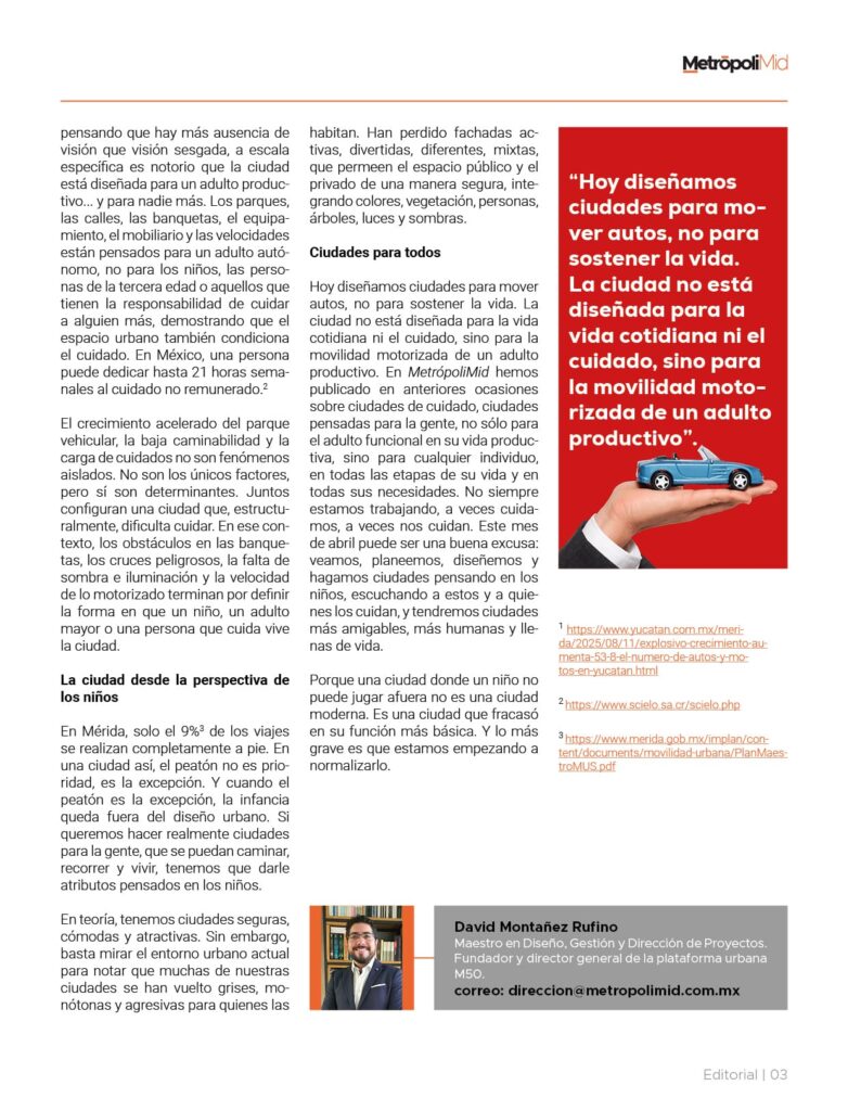 Hoy diseñamos ciudades para mover autos, no para sostener la vida. La ciudad no está diseñada para la vida cotidiana ni el cuidado, sino para la movilidad motorizada de un adulto productivo. En MetrópoliMid hemos publicado en anteriores ocasiones sobre ciudades de cuidado, ciudades pensadas para la gente, no sólo para el adulto funcional en su vida productiva, sino para cualquier individuo, en todas las etapas de su vida y en todas sus necesidades. No siempre estamos trabajando, a veces cuidamos, a veces nos cuidan. Este mes de abril puede ser una buena excusa: veamos, planeemos, diseñemos y hagamos ciudades pensando en los niños, escuchando a estos y a quienes los cuidan, y tendremos ciudades más amigables, más humanas y llenas de vida.